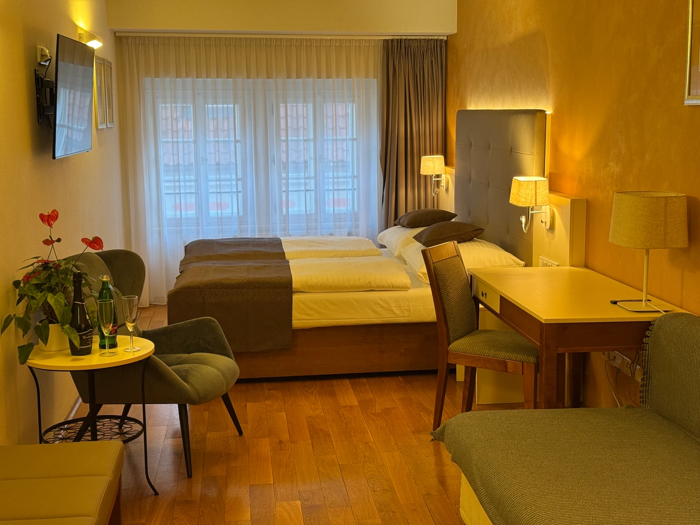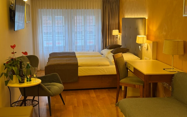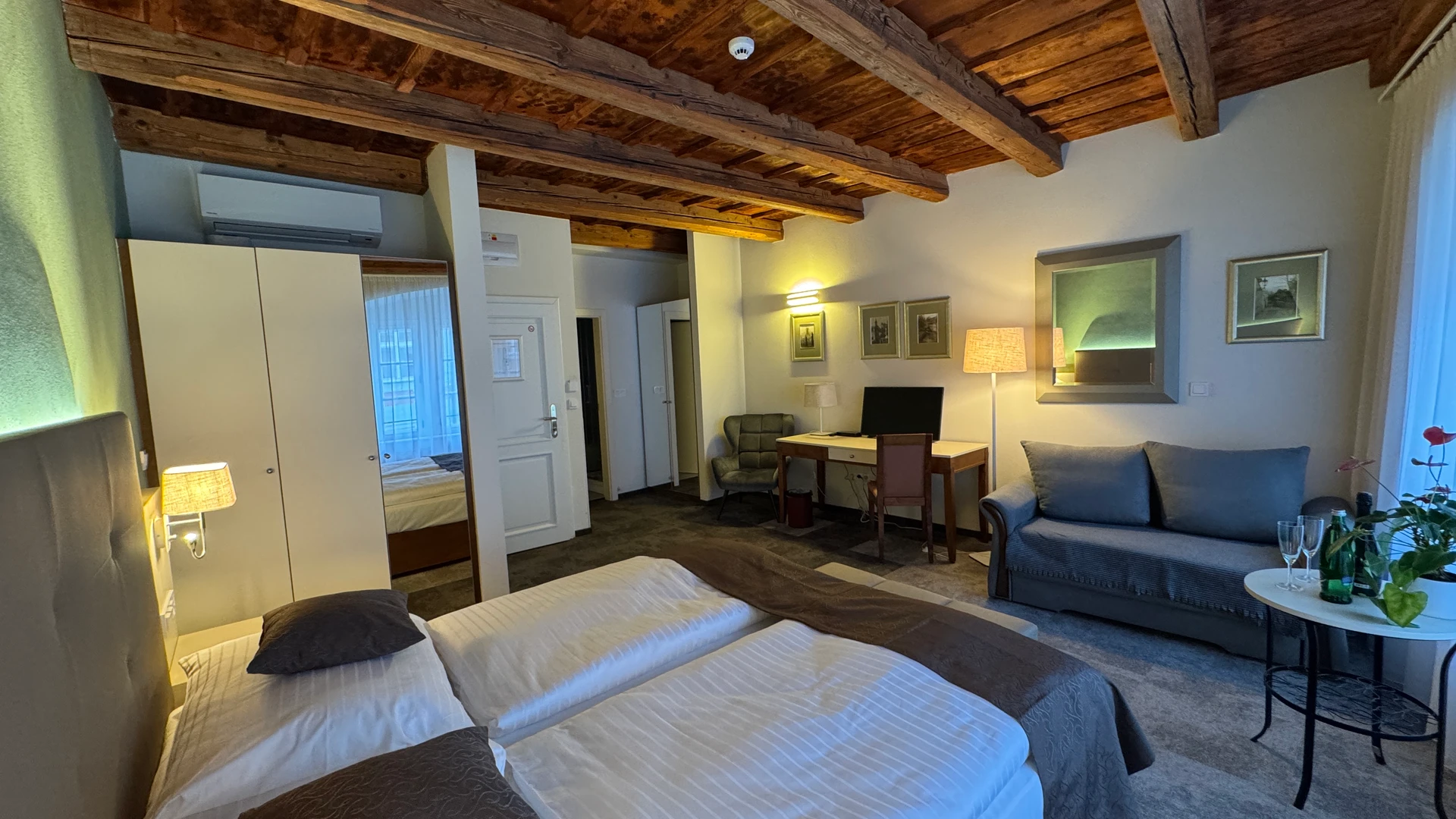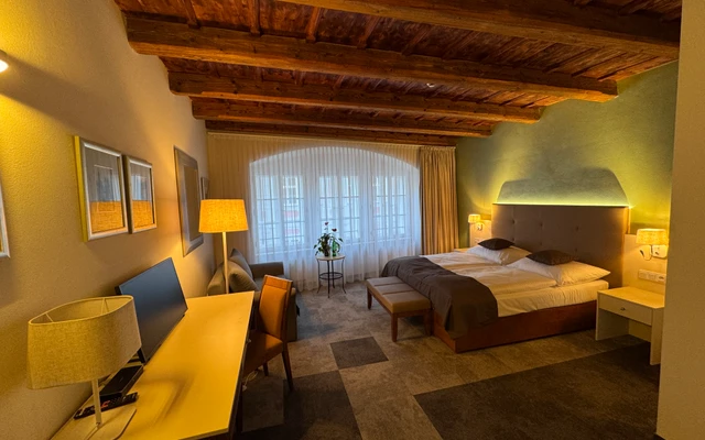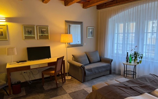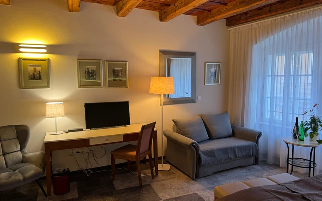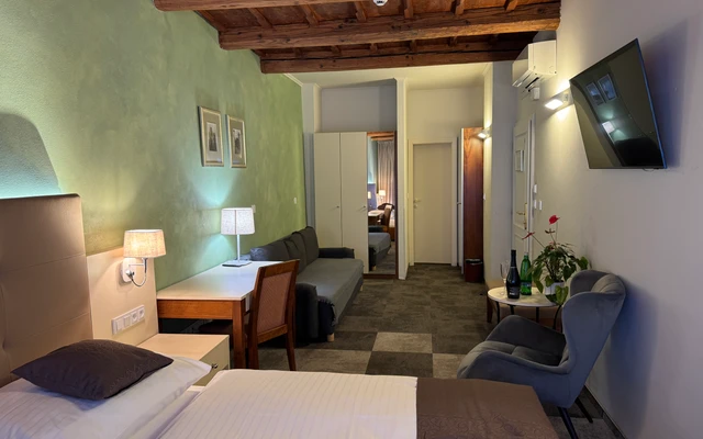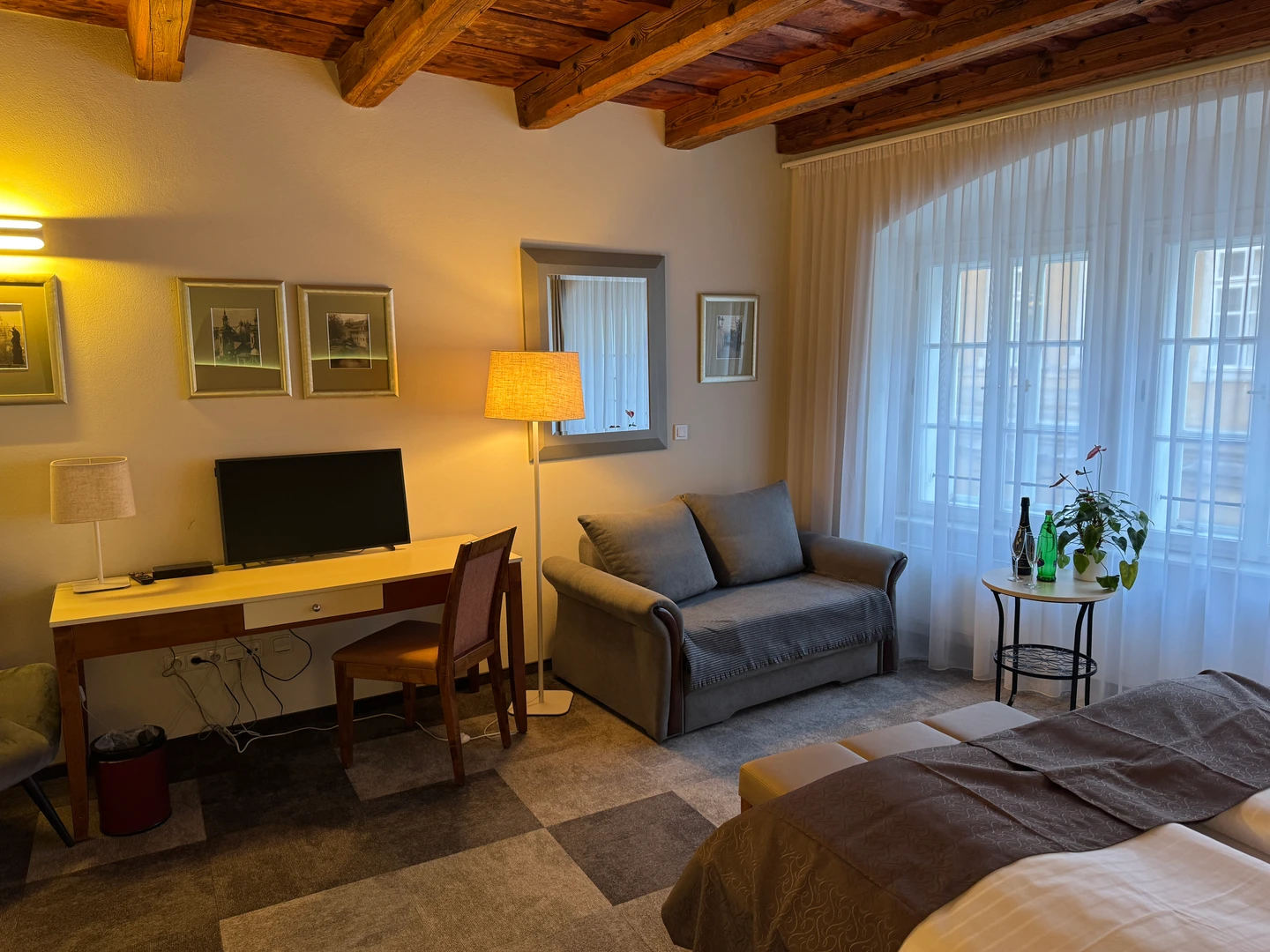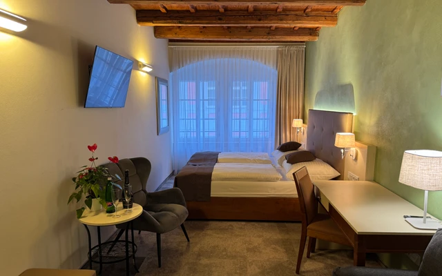 Junior Suite Deluxe nabízí prostorné a elegantní ubytování v nově zrekonstruovaných prostorách historické budovy. Interiér kombinuje půvab klasických prvků s moderním stylem a maximálním pohodlím. Součástí pokoje je pohodlný rozkládací gauč, ideální pro odpočinek nebo ubytování dalších hostů. K vybavení patří prostorná koupelna, kvalitní postel a klidný výhled na historické uličky nebo vnitřní dvůr.