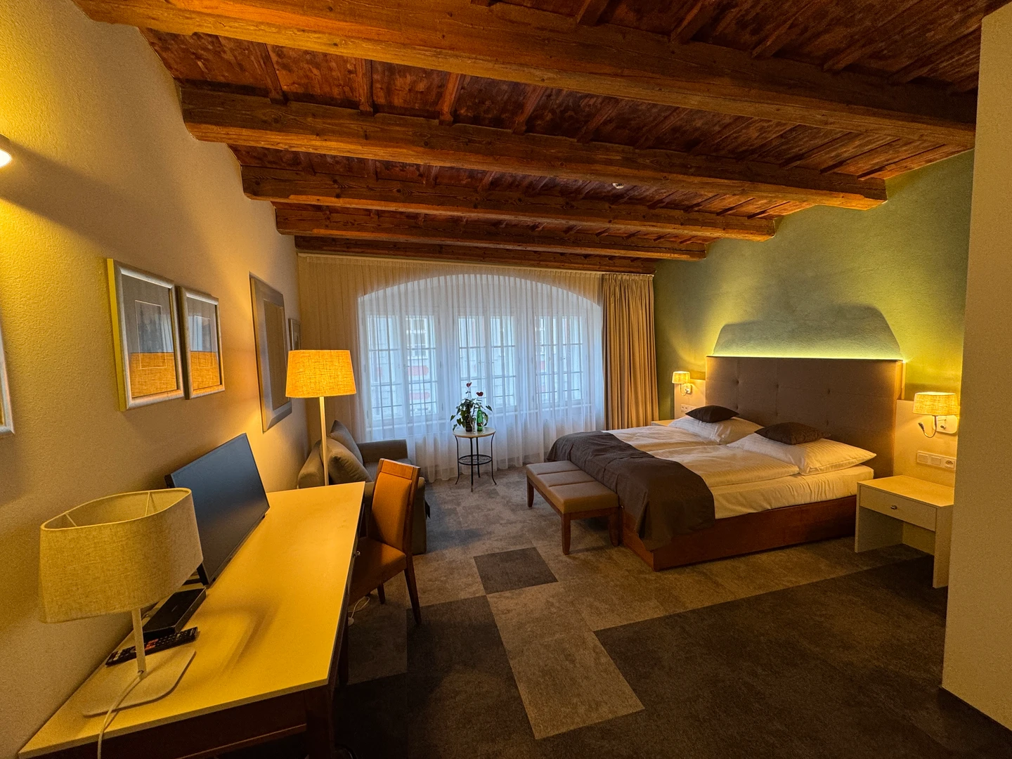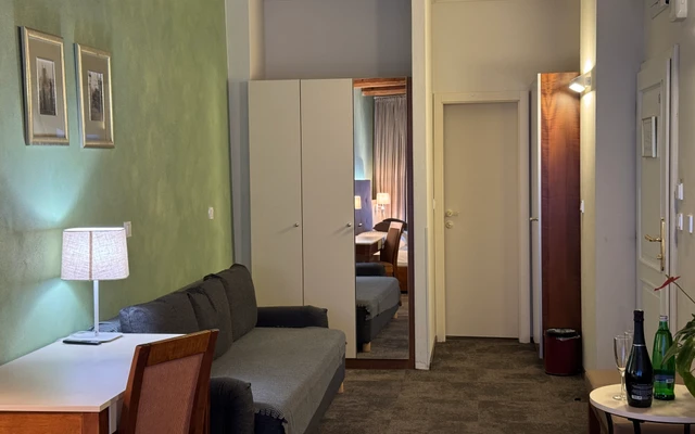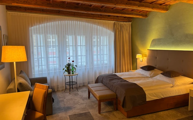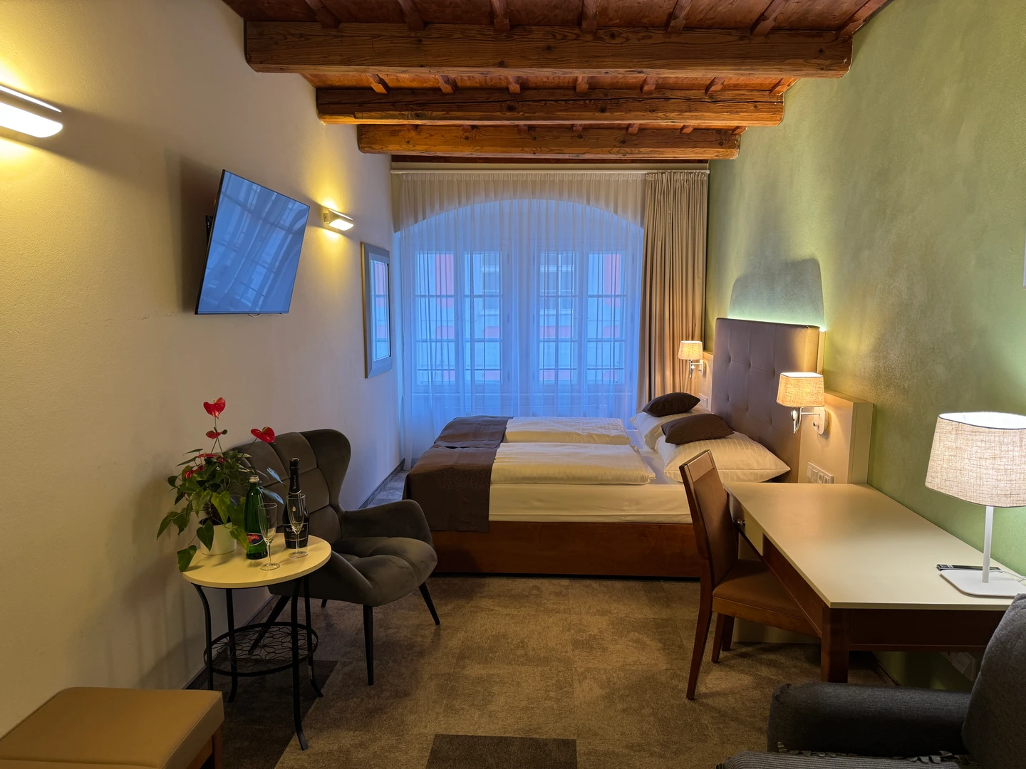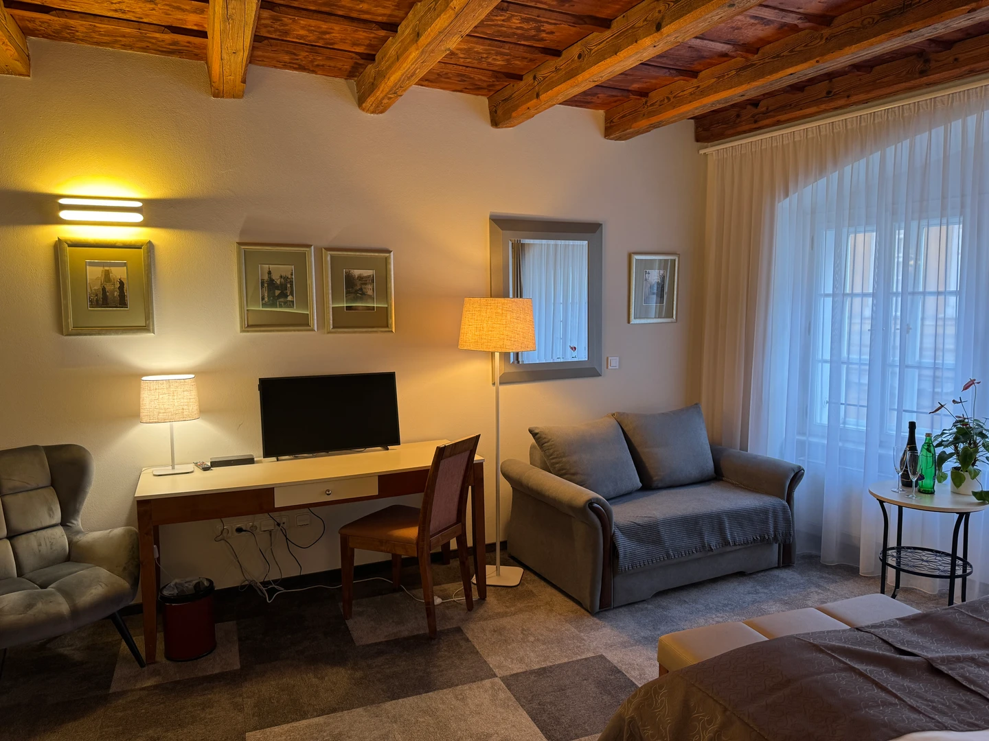 Junior Suite Deluxe nabízí prostorné a elegantní ubytování v nově zrekonstruovaných prostorách historické budovy. Interiér kombinuje půvab klasických prvků s moderním stylem a maximálním pohodlím. Součástí pokoje je pohodlný rozkládací gauč, ideální pro odpočinek nebo ubytování dalších hostů. K vybavení patří prostorná koupelna, kvalitní postel a klidný výhled na historické uličky nebo vnitřní dvůr.