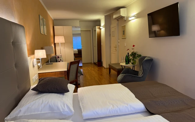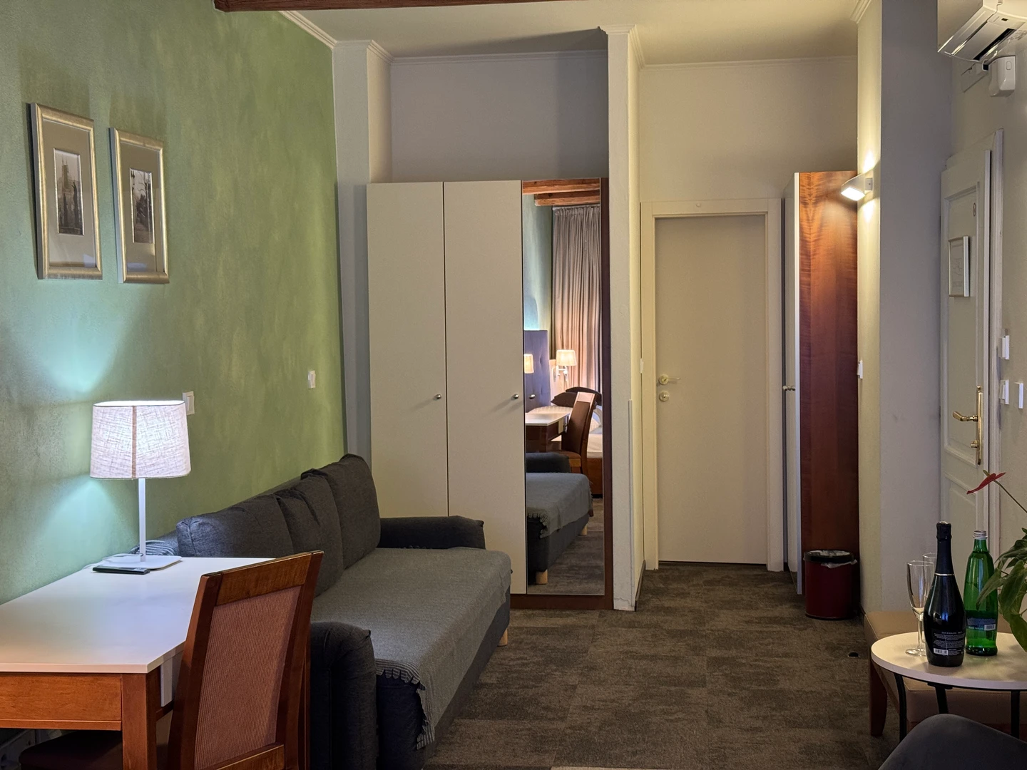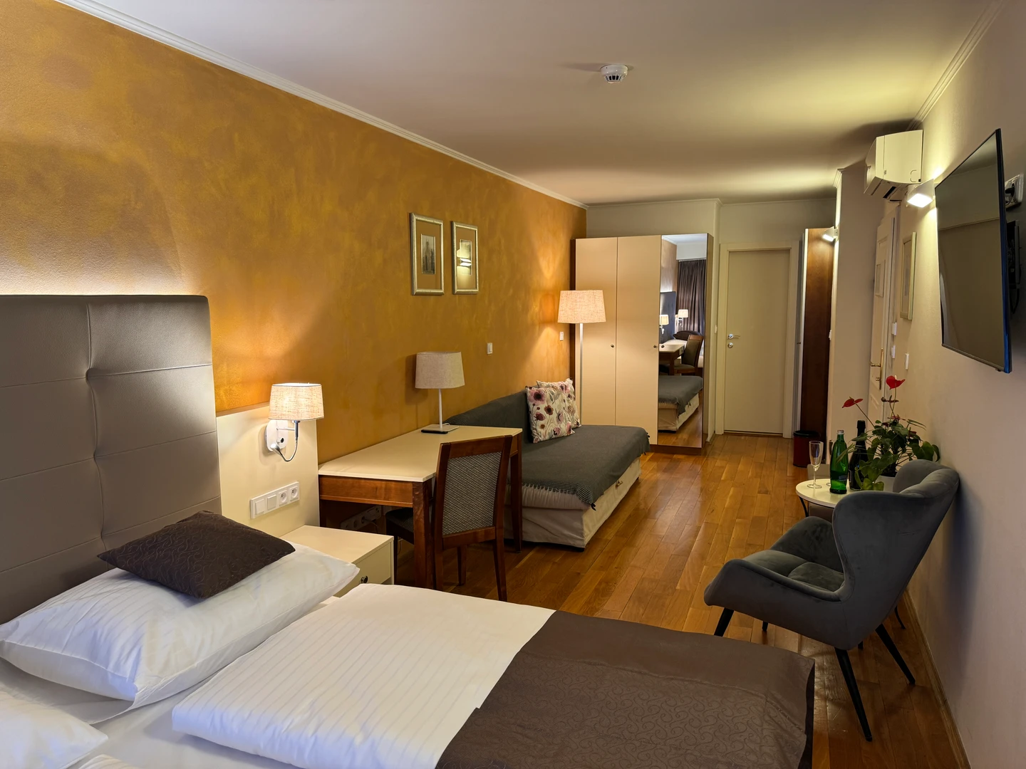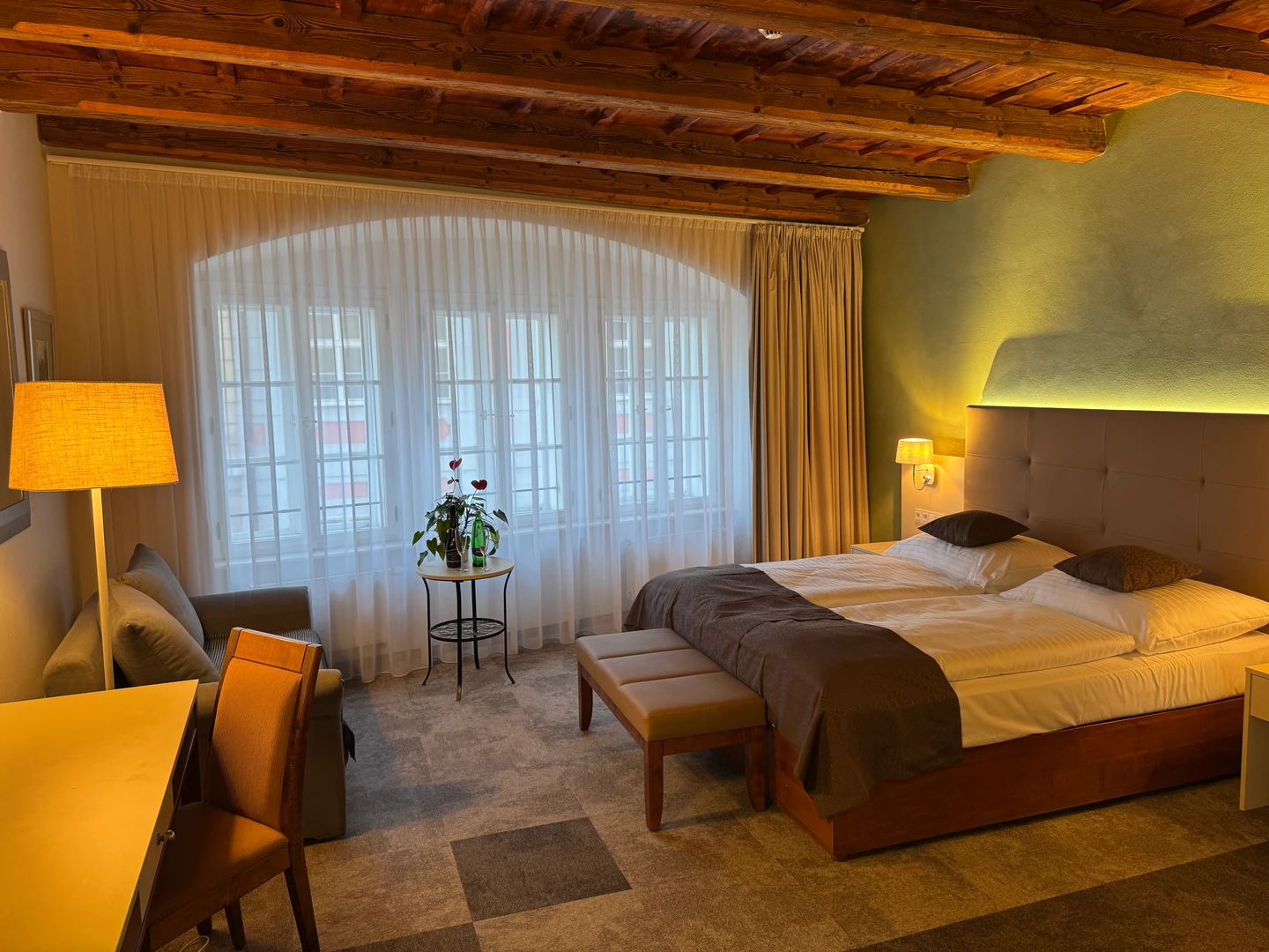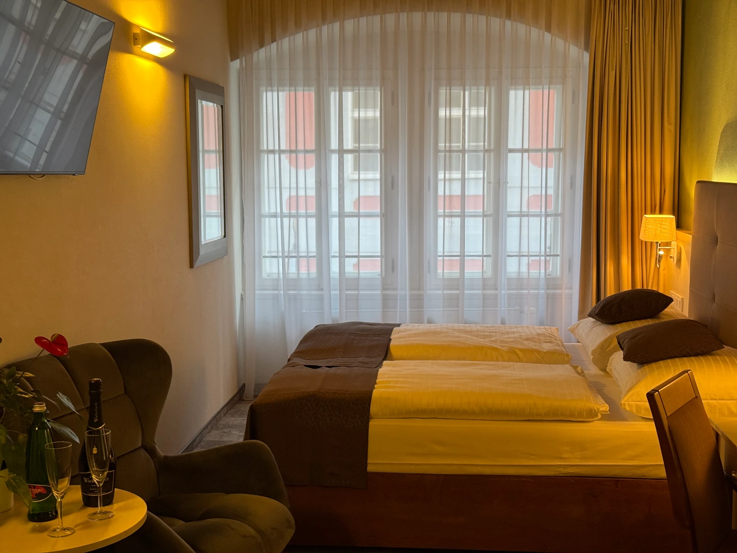 Junior Suite Deluxe nabízí prostorné a elegantní ubytování v nově zrekonstruovaných prostorách historické budovy. Interiér kombinuje půvab klasických prvků s moderním stylem a maximálním pohodlím. Součástí pokoje je pohodlný rozkládací gauč, ideální pro odpočinek nebo ubytování dalších hostů. K vybavení patří prostorná koupelna, kvalitní postel a klidný výhled na historické uličky nebo vnitřní dvůr.