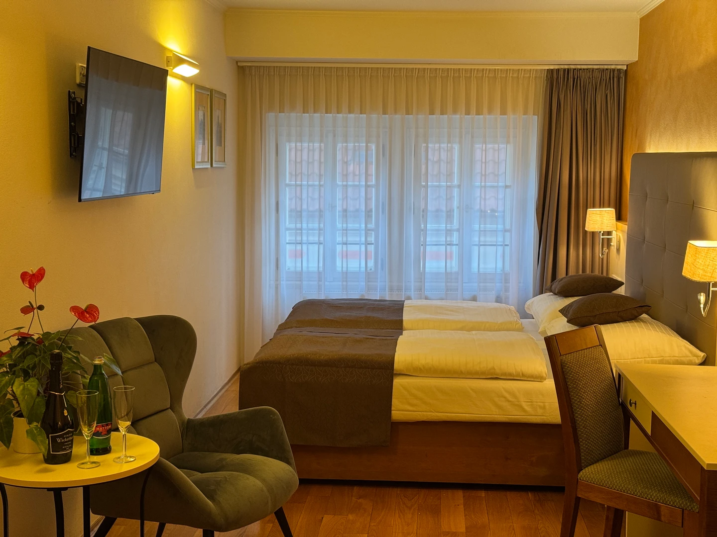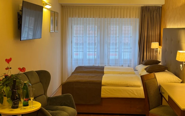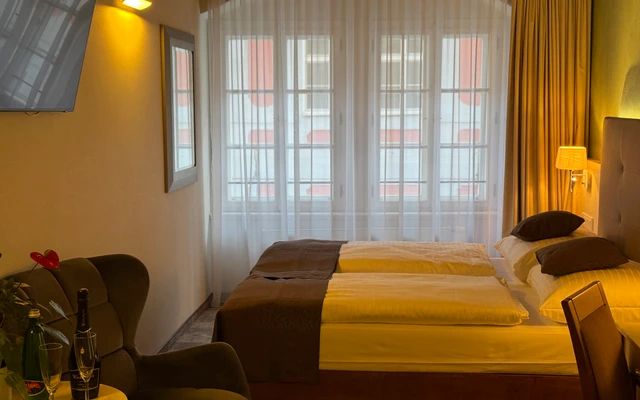Dvoulůžkový pokoj Deluxe spojuje historický půvab s moderním komfortem. Stylový interiér s vysokými stropy a kvalitní postelí nabízí klidné zázemí s výhledem do historických uliček nebo na vnitřní dvůr.