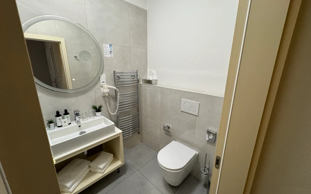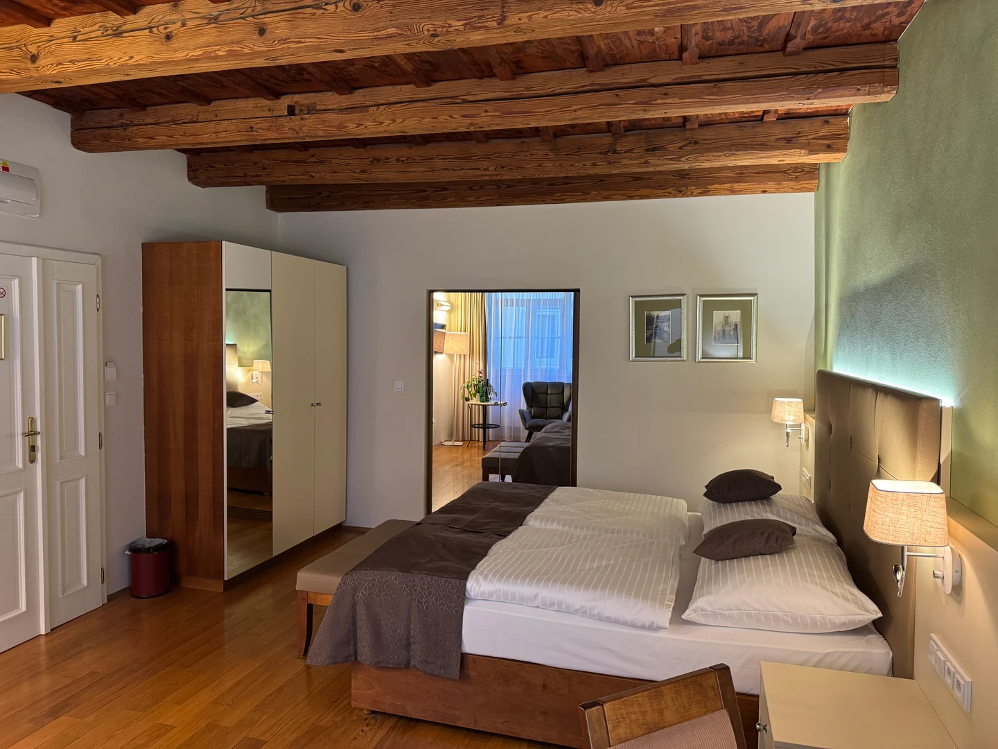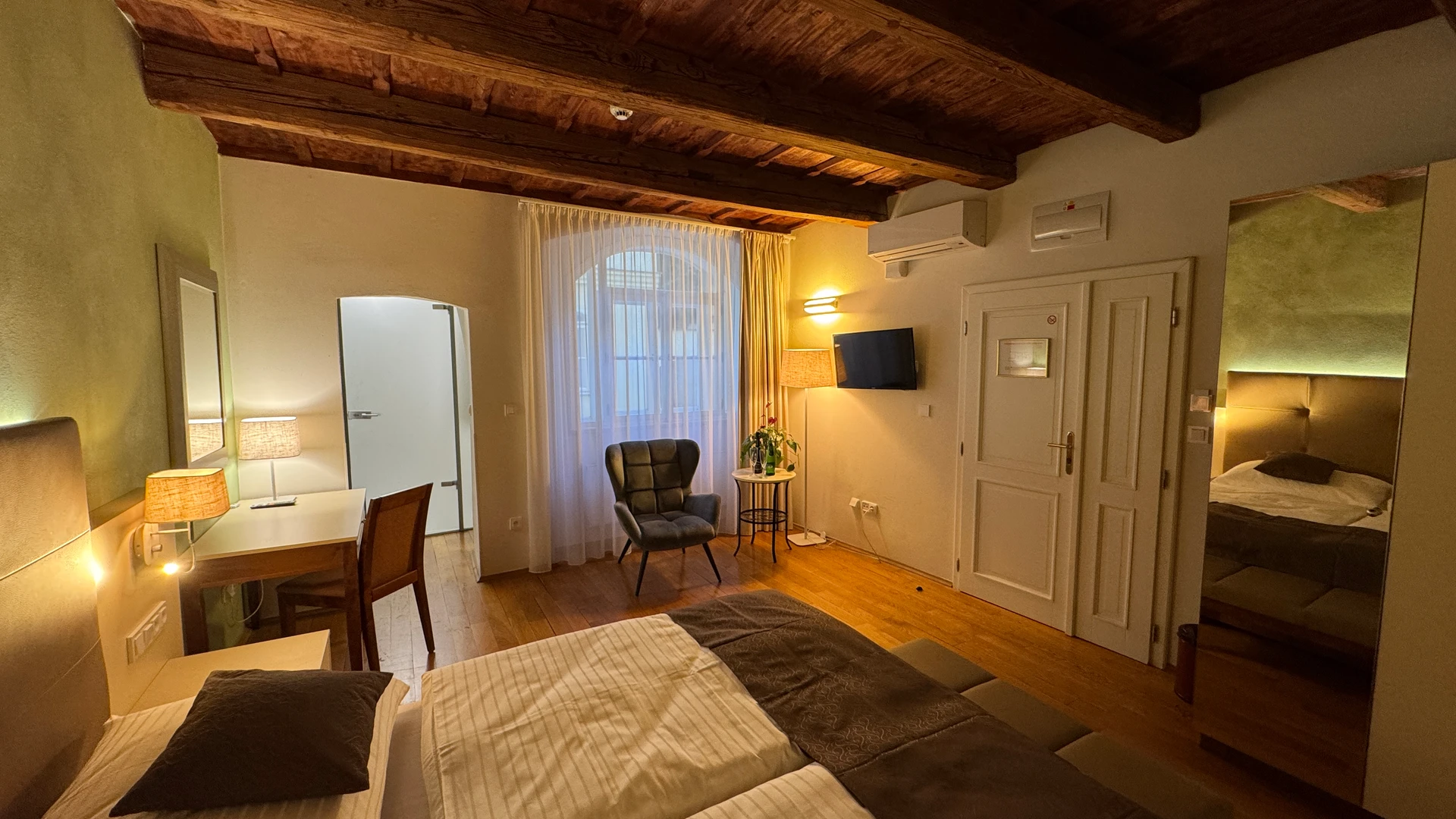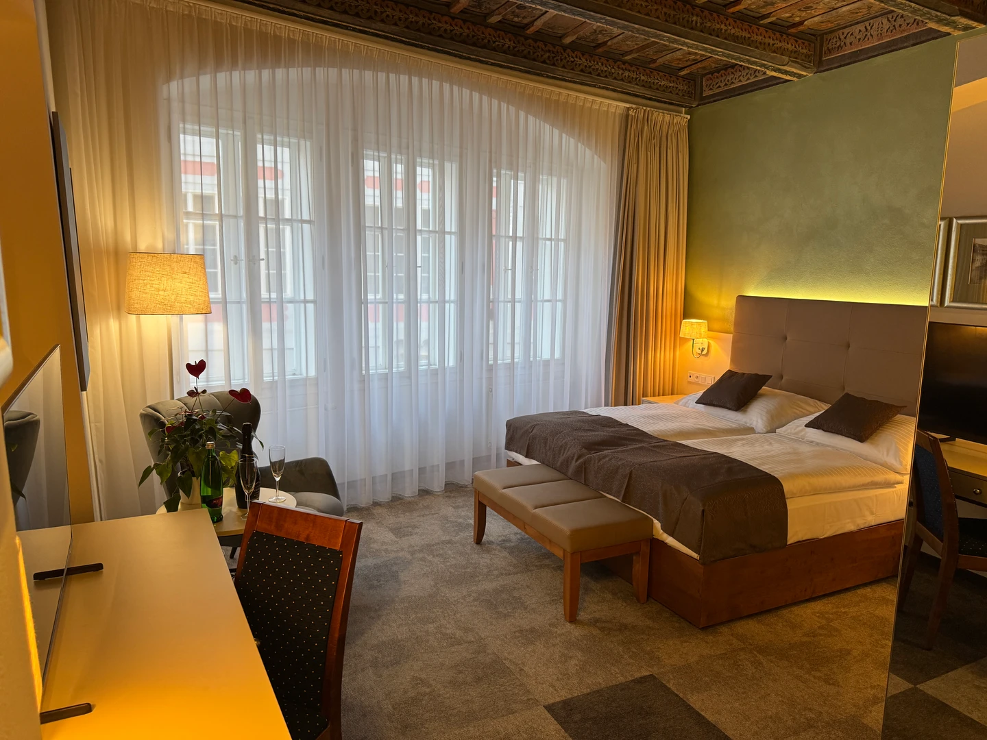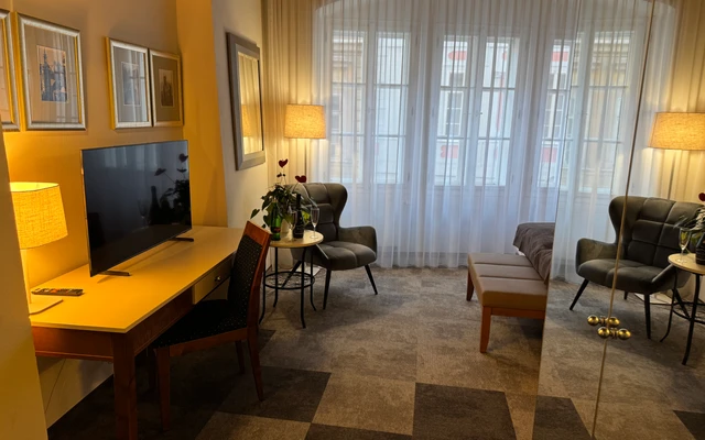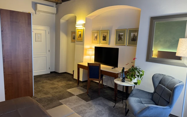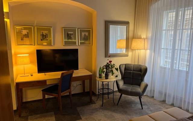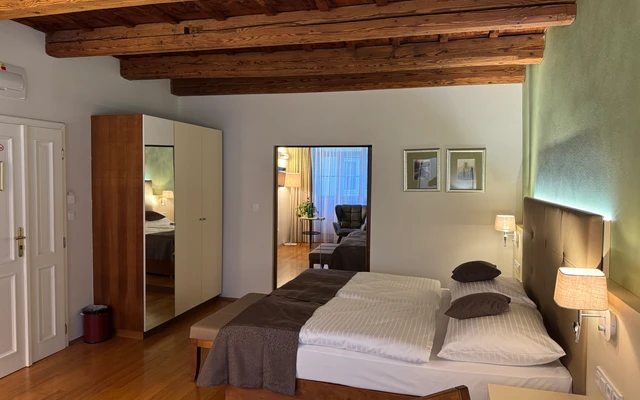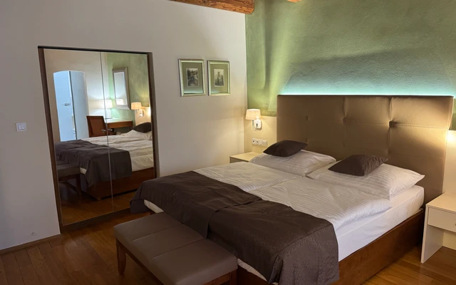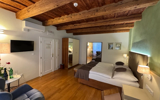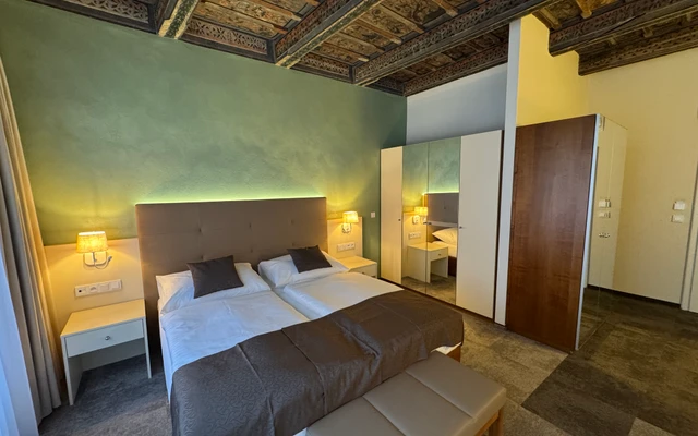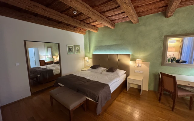 Dvoulůžkový pokoj Deluxe nabízí elegantní ubytování v nově zrekonstruovaných prostorách historické budovy. Spojuje půvab původní architektury s moderním komfortem a designem. Světlý interiér s vysokými stropy, stylovým nábytkem a pečlivě zvolenými detaily vytváří příjemnou atmosféru pro odpočinek i práci. Hosté ocení prostornou koupelnu, kvalitní postel a výhled na klidné historické uličky či vnitřní dvůr.