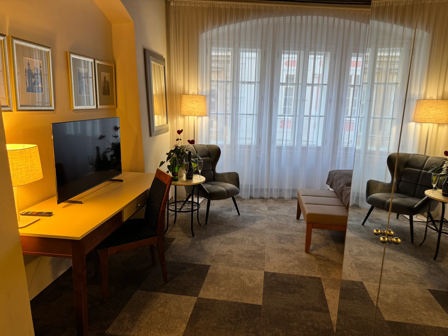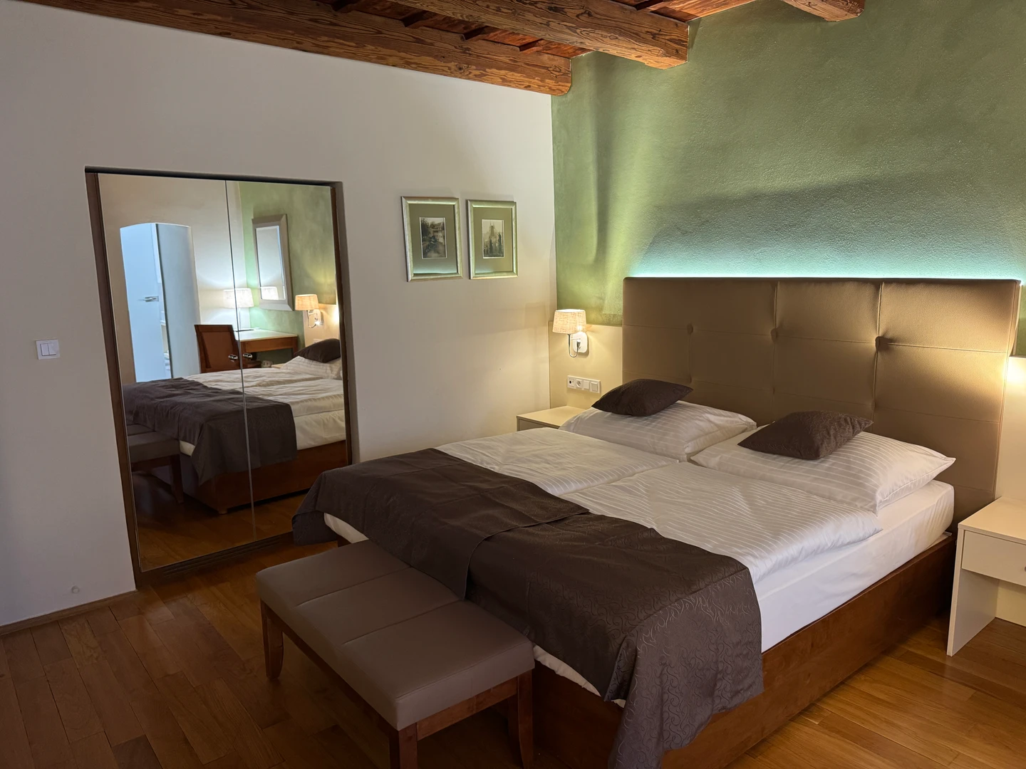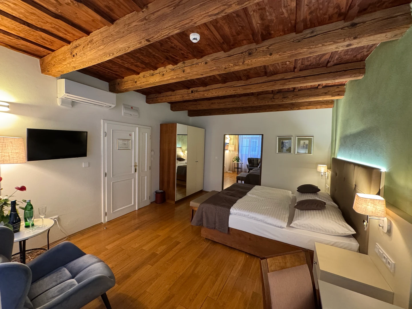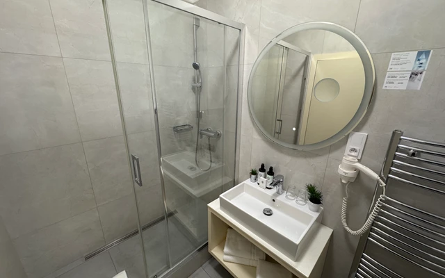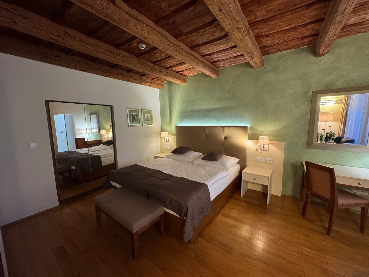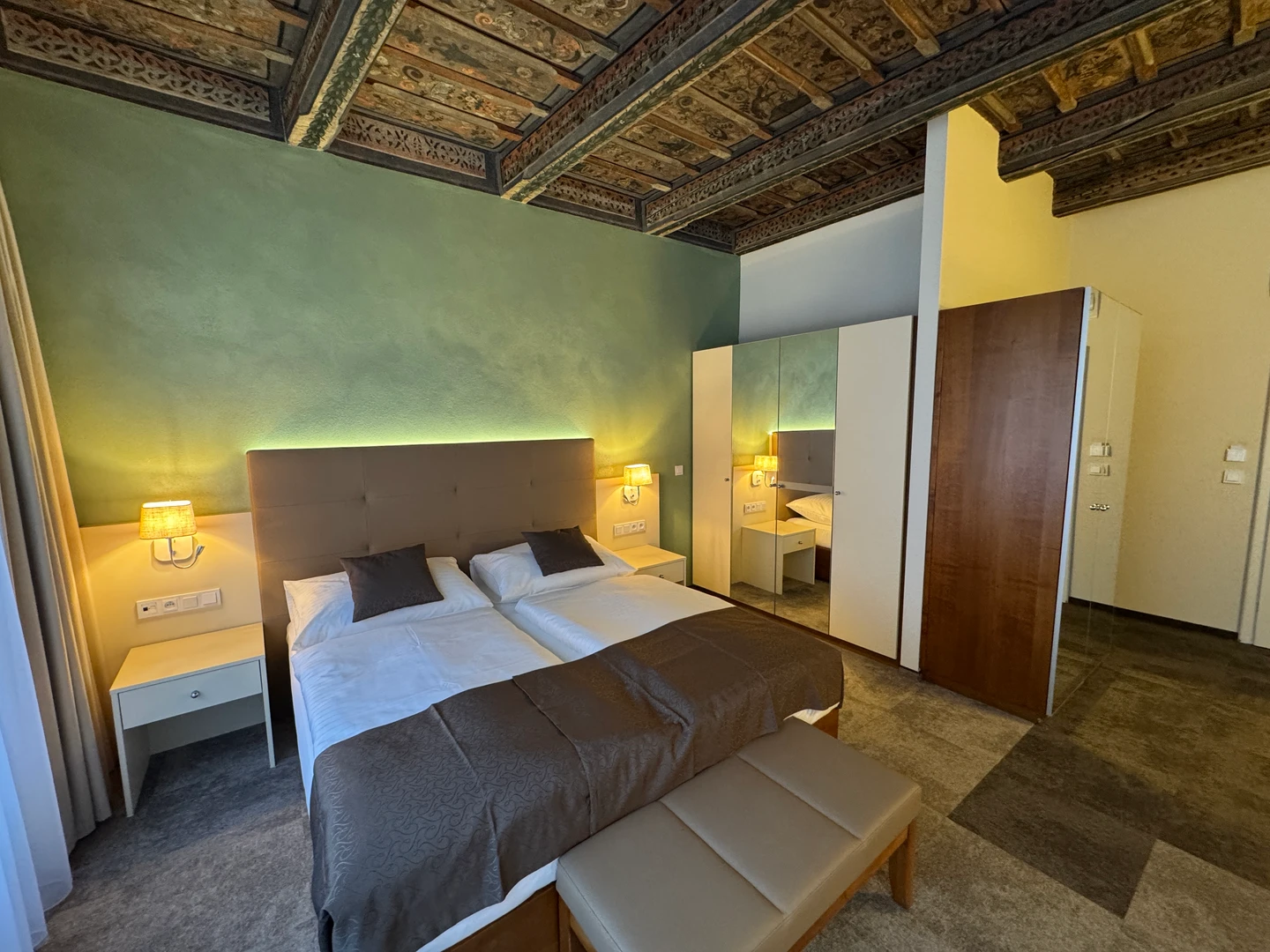 Dvoulůžkový pokoj Deluxe nabízí elegantní ubytování v nově zrekonstruovaných prostorách historické budovy. Spojuje půvab původní architektury s moderním komfortem a designem. Světlý interiér s vysokými stropy, stylovým nábytkem a pečlivě zvolenými detaily vytváří příjemnou atmosféru pro odpočinek i práci. Hosté ocení prostornou koupelnu, kvalitní postel a výhled na klidné historické uličky či vnitřní dvůr.